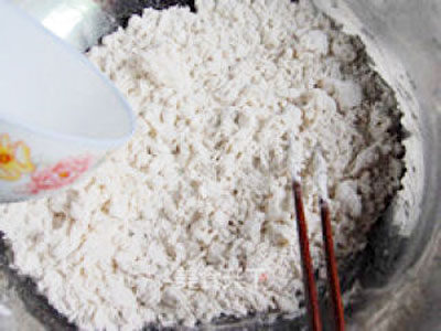 準(zhǔn)備一個不銹鋼盆放入500克面粉,將酵母倒進30度左右的溫水里,用筷子攪拌融化,將酵母水倒入,邊倒入邊用筷子攪拌成絮狀。