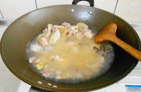 倒入雞塊翻炒,炒至雞肉表面斷生,加入適量米酒(米酒的量就是之后湯的量),三個加熱開關全打開,煮至沸騰,沸騰后再煮5分鐘左右。