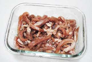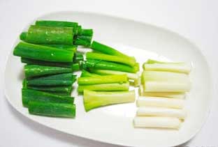 章丘大蔥洗凈切段,蔥白段從中間切開,蔥白與蔥葉分開放(長度與肉絲相近)。蒜瓣切末備用。