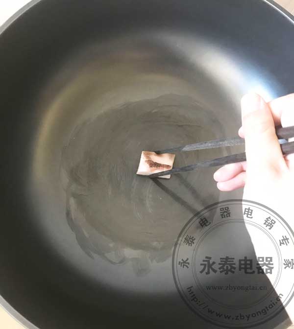 下邊我們開始使用一下,看看好不好用。鐵鍋第一次使用要先開鍋,準(zhǔn)備一塊肥豬肉,用筷子夾住生肥豬肉,以螺旋狀在鍋內(nèi)壁不停地擦拭,油脂均勻地涂滿整個鍋面。重復(fù)幾次,大概十幾分鐘即可。