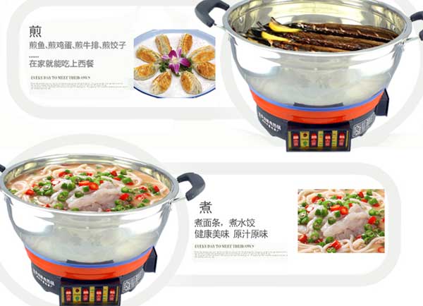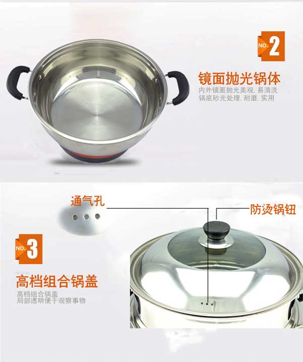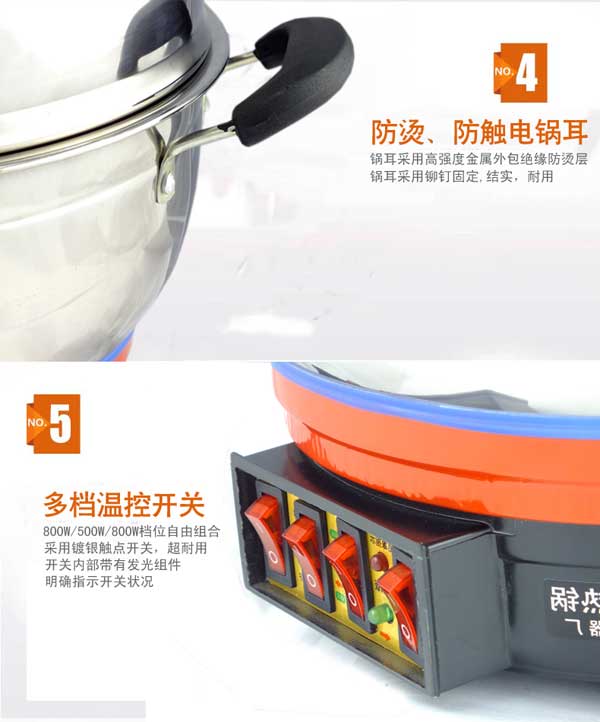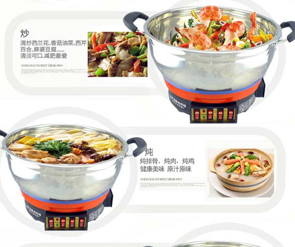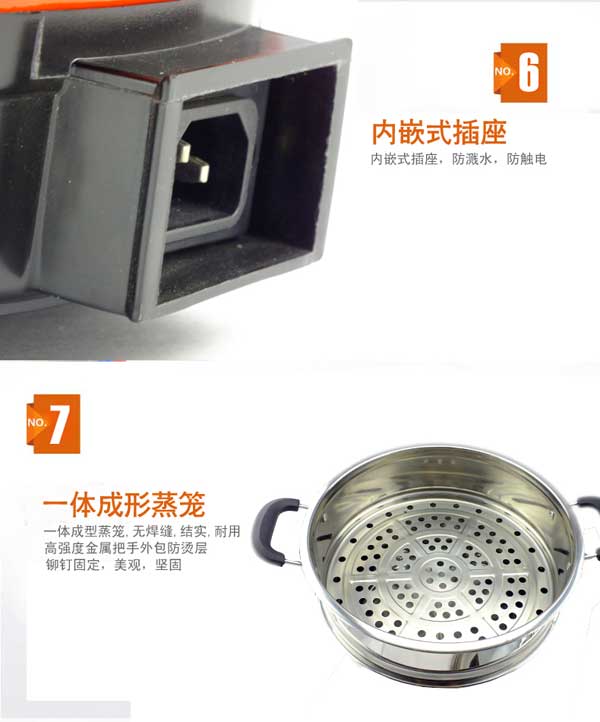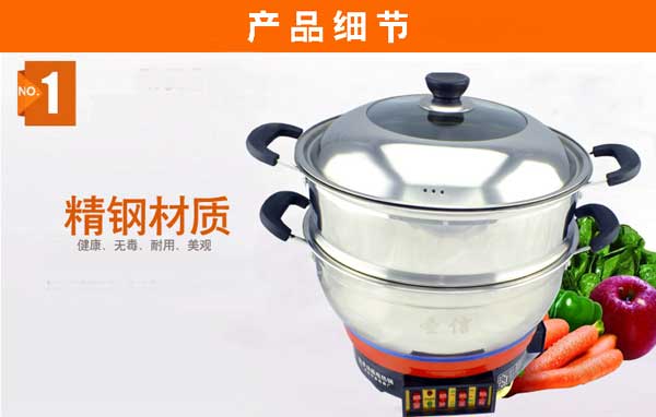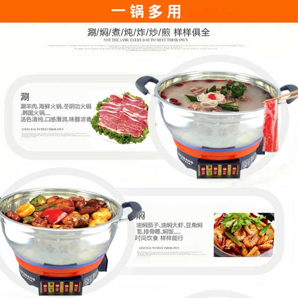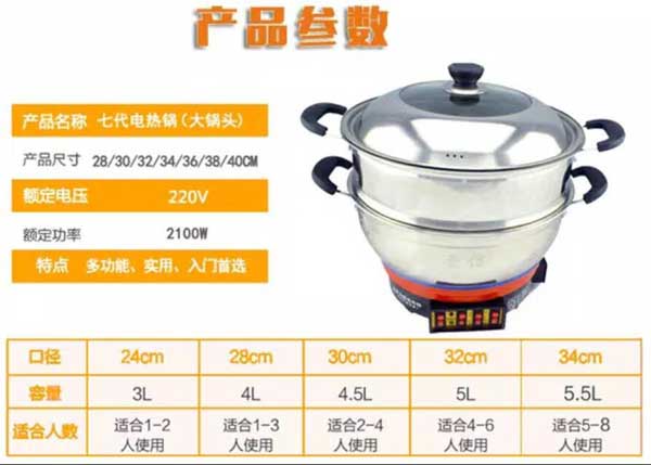 七代大鍋頭電熱鍋,多功能,煎、炸、炒、烙、蒸、燜、涮樣樣精通,鍋體采用不銹鋼制造,蒸籠采用不銹鋼一體成型蒸籠,內(nèi)部采用三根加熱管獨(dú)立加熱,三檔+保溫?fù)跷唬瑑?nèi)部設(shè)有溫控器,可有效防止干燒導(dǎo)致電熱鍋的損壞,結(jié)實(shí)耐用,美觀(guān)實(shí)用。